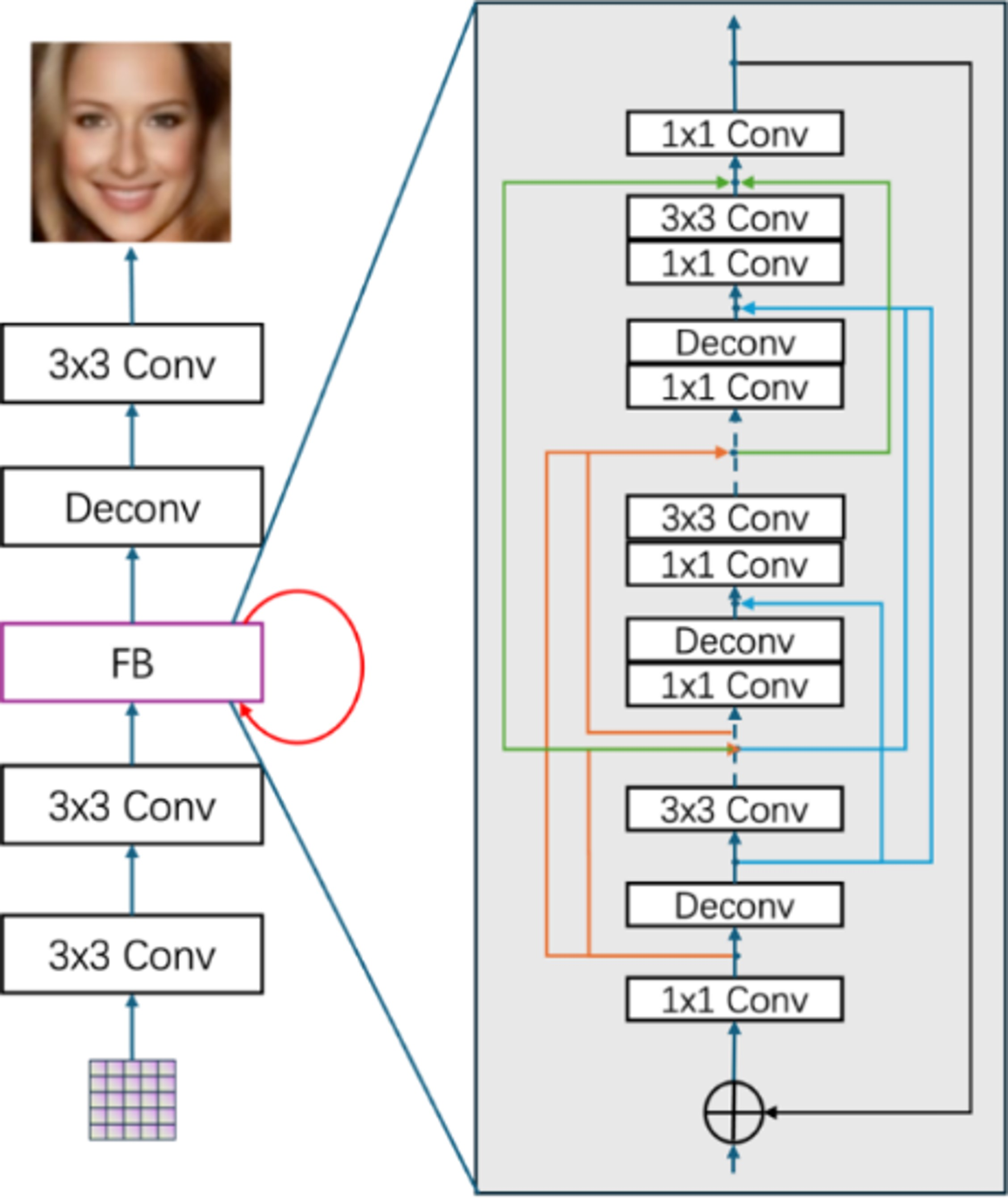 long-range dependencies and global facial structure, (3) a Recurrent Super-Resolution