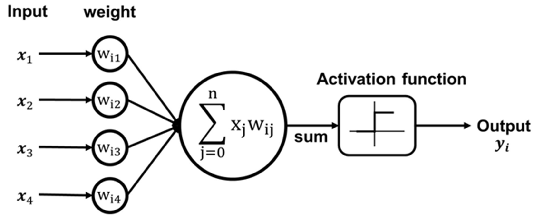 by corresponding weights (e.g., wi1), summing the results, and passing them through
