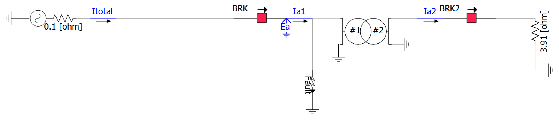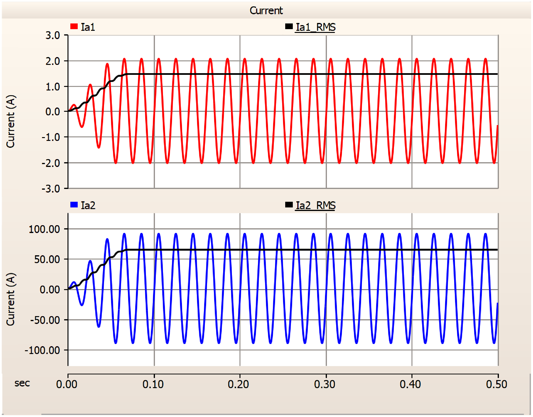 Fig. 8은 1선지락고장시 전압위상각에 따른 1차측 전류의 비교를 나타낸다. 1차측 전류의 실효치는 95.652A, 2차측 전류의 실효치는 5.519A로,
