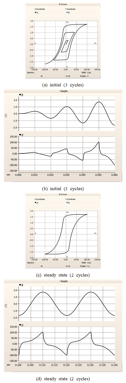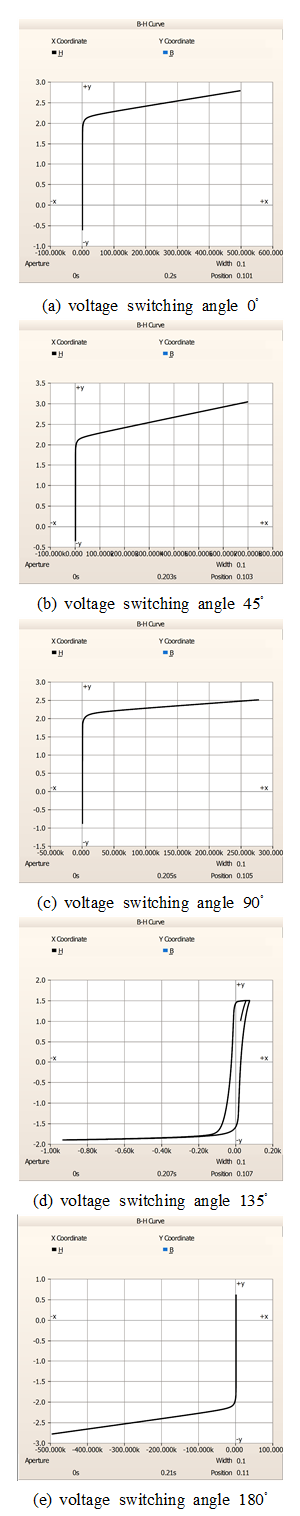 히스테리시스 곡선 궤적의 비교를 나타낸다. Fig. 4(a)는 전압위상각 0° 가압직후(0.1s), 2주기(0.04s) 동안의 히스테리시스 곡선의 변화를 나타낸다. H, B값은, 1/4주기 동안 (10.800,