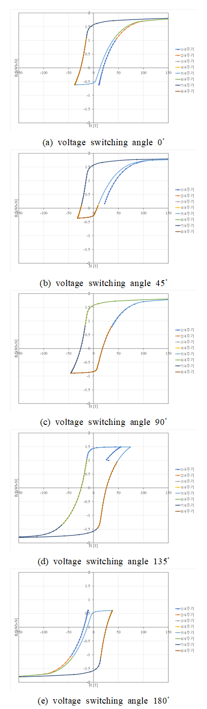 Fig. 5는 여자돌입시 전압위상각 가변에 따른 200주기(0.1s∼0.5s) 동안의 히스테리시스 곡선의 비교를 나타낸다. Fig. 5(a)는 전압위상각이 0°인 경우, 포화점의 변화 양상을 나타낸다. 1사분면의 어깨 영역 루프 끝 부분의 값이 매우 큰 것을 알 수 있다.