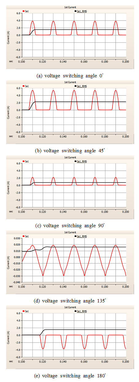 Table 1은 여자돌입시 전압위상각에 따른 1차측 여자돌입전류의 순시치의 양과 음의 최대치와 실효치의 비교를 나타낸다. 전압위상각의 가변에 따라 순시치 및 실효치가