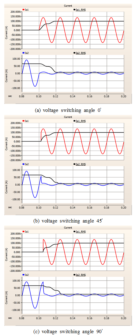 Fig. 6은 여자돌입시 전압위상각에 따른 1차측 전류의 비교를 나타낸다. 전압위상각에 따라 1차측 전류는 과도 비대칭 형태를 나타내고 2차측 전류는 거의 흐르지