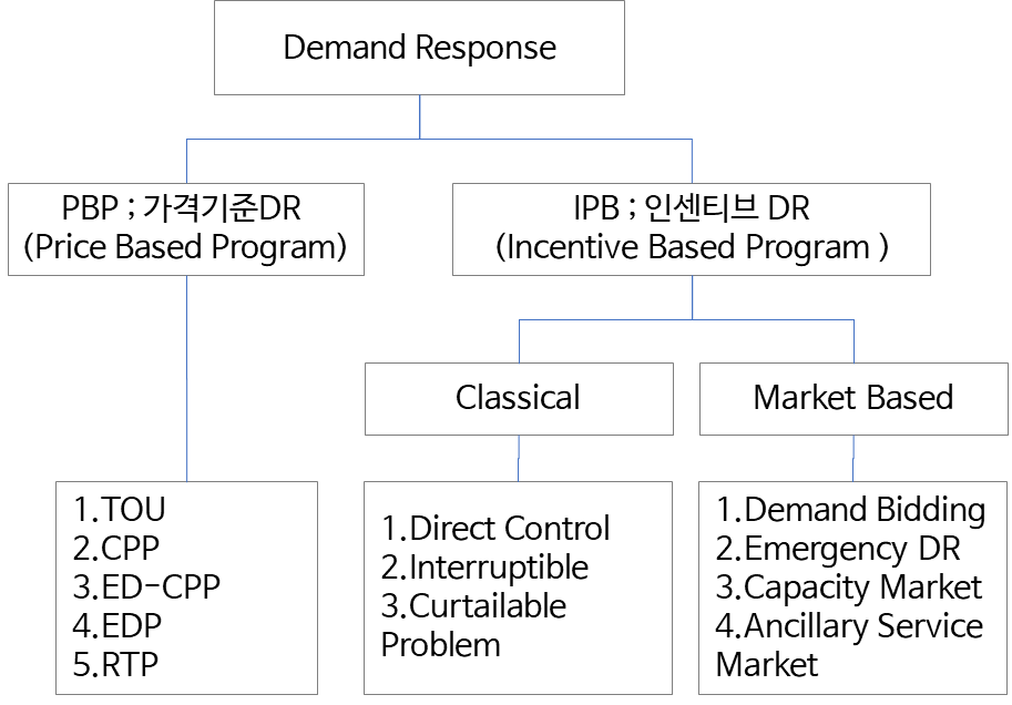 Fig. 1에서와 같이 DR은 도매전력시장의 가격에 따라 반응하는 경제성DR과 전력계통의 신뢰도 확보를 목적으로 수요에 반응하는 신뢰성DR로 분류하고 있다.