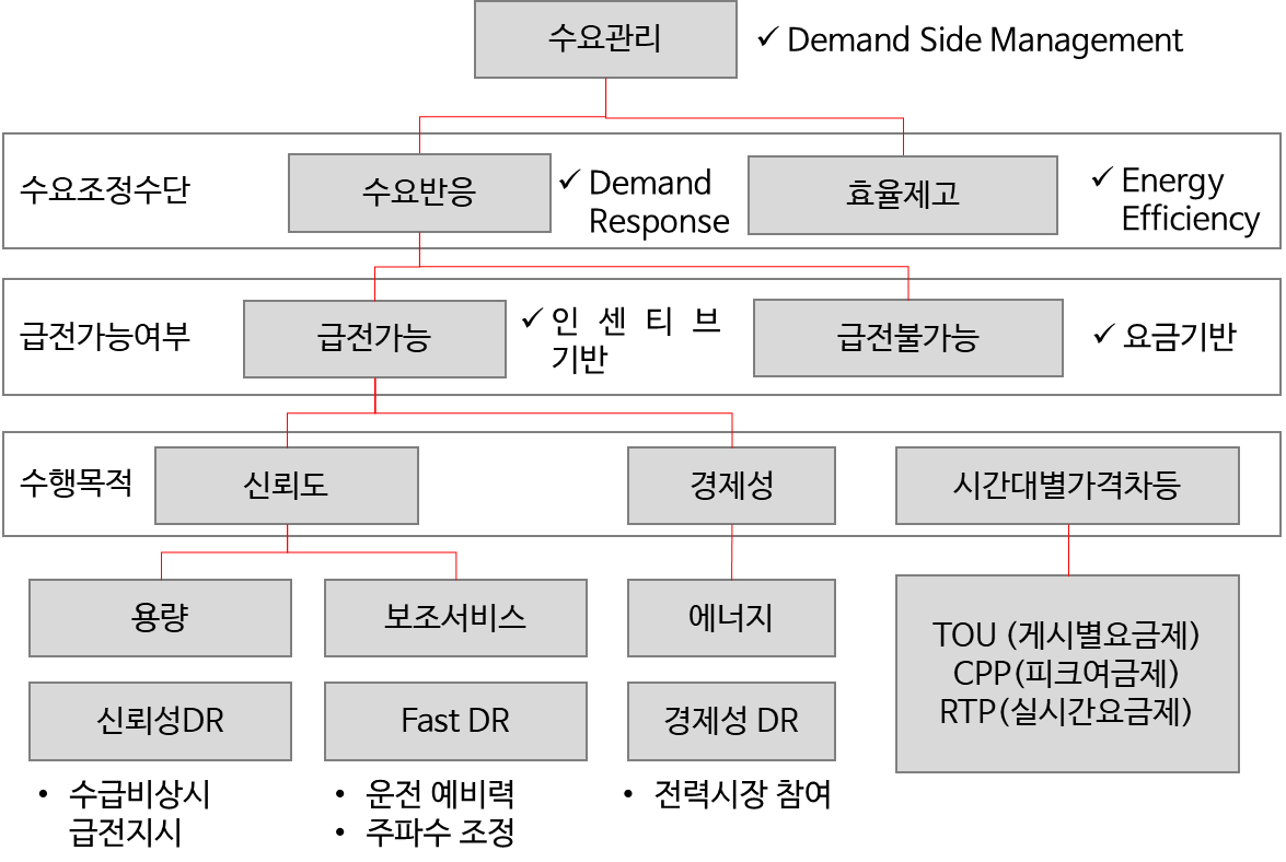 높을 때에는 전기 소비를 줄이도록 유도하거나 계통 신뢰도 확보를 목적으로 전력수요를 일으키는 행위로 정의하고 있다[2].