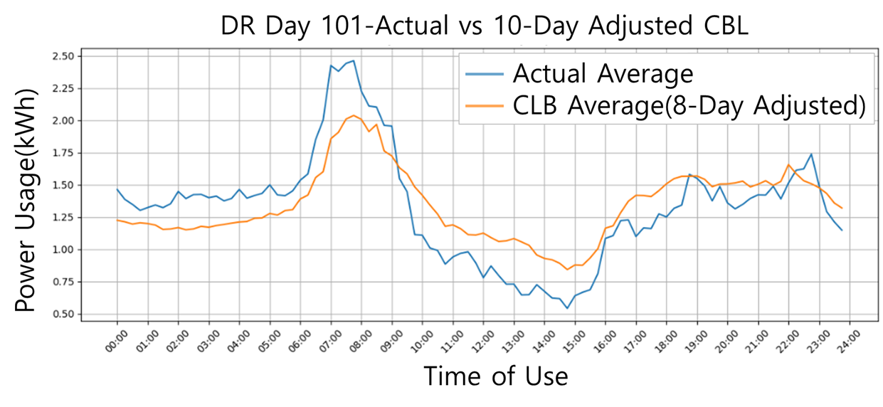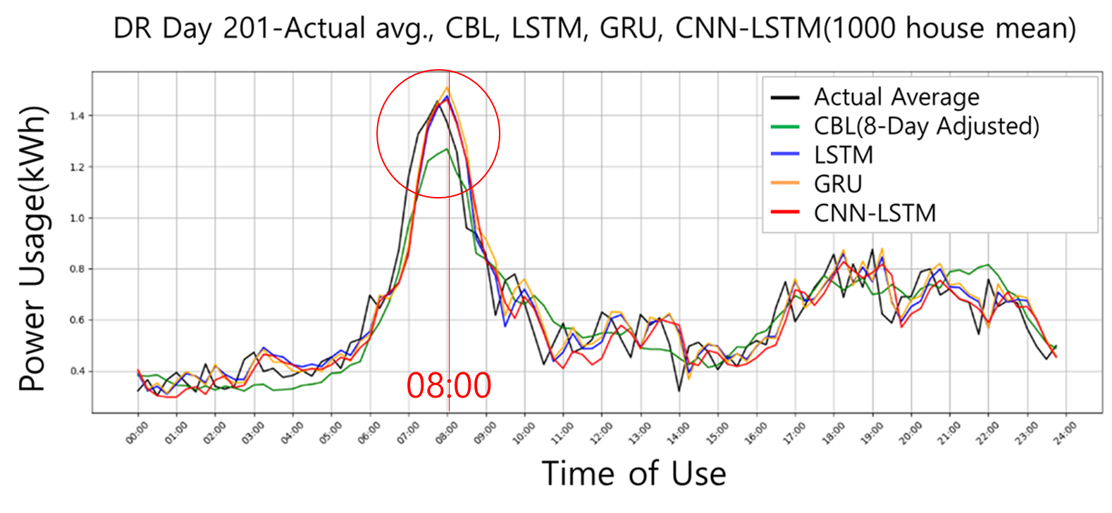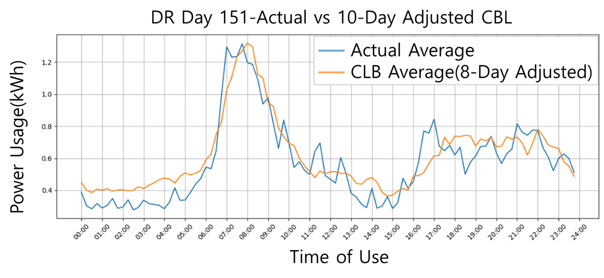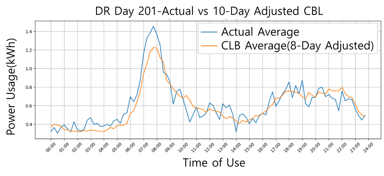 학습을 수행한 결과 Fig. 6과 같이 기존의 CBL(Green)은 200일 기준 10 Day-Adjusted 기준 DR+201에 대한 1,000가구의 평균 부하 프로파일에 적용했을