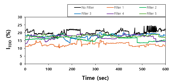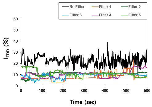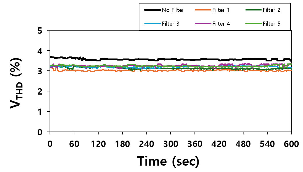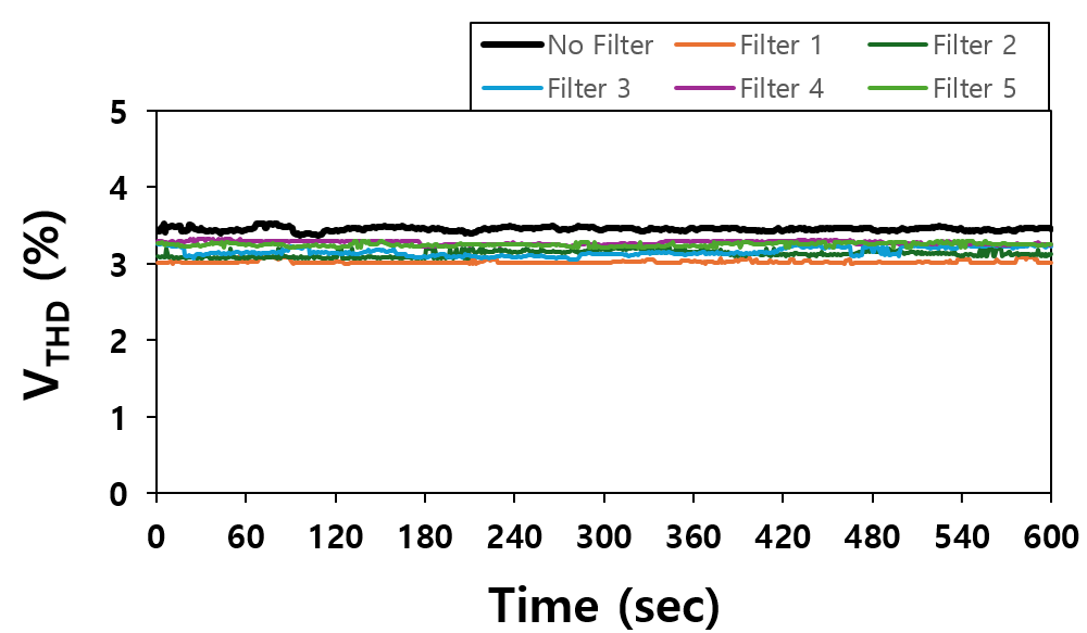 1~Filter 5 모두 $I_{TDD}$가 감소하여 정상적인 필터의 기능을 보여주고 있다. 전반적으로 Filter 1을 사용할 경우, 고조파 저감