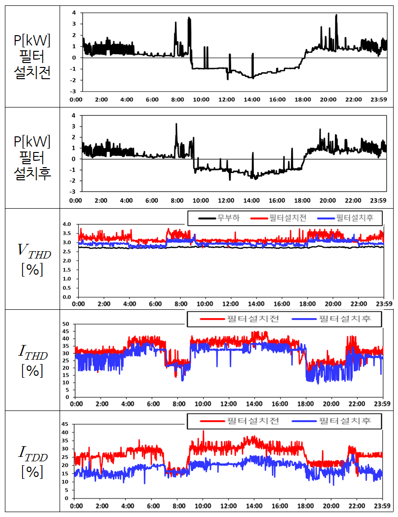필터 설치 후 측정 결과, $V_{THD}$는 약 12~16% 감소하였고, $I_{TDD}$는 최대 약 47%까지 저감되었다. 특히 태양광 발전이