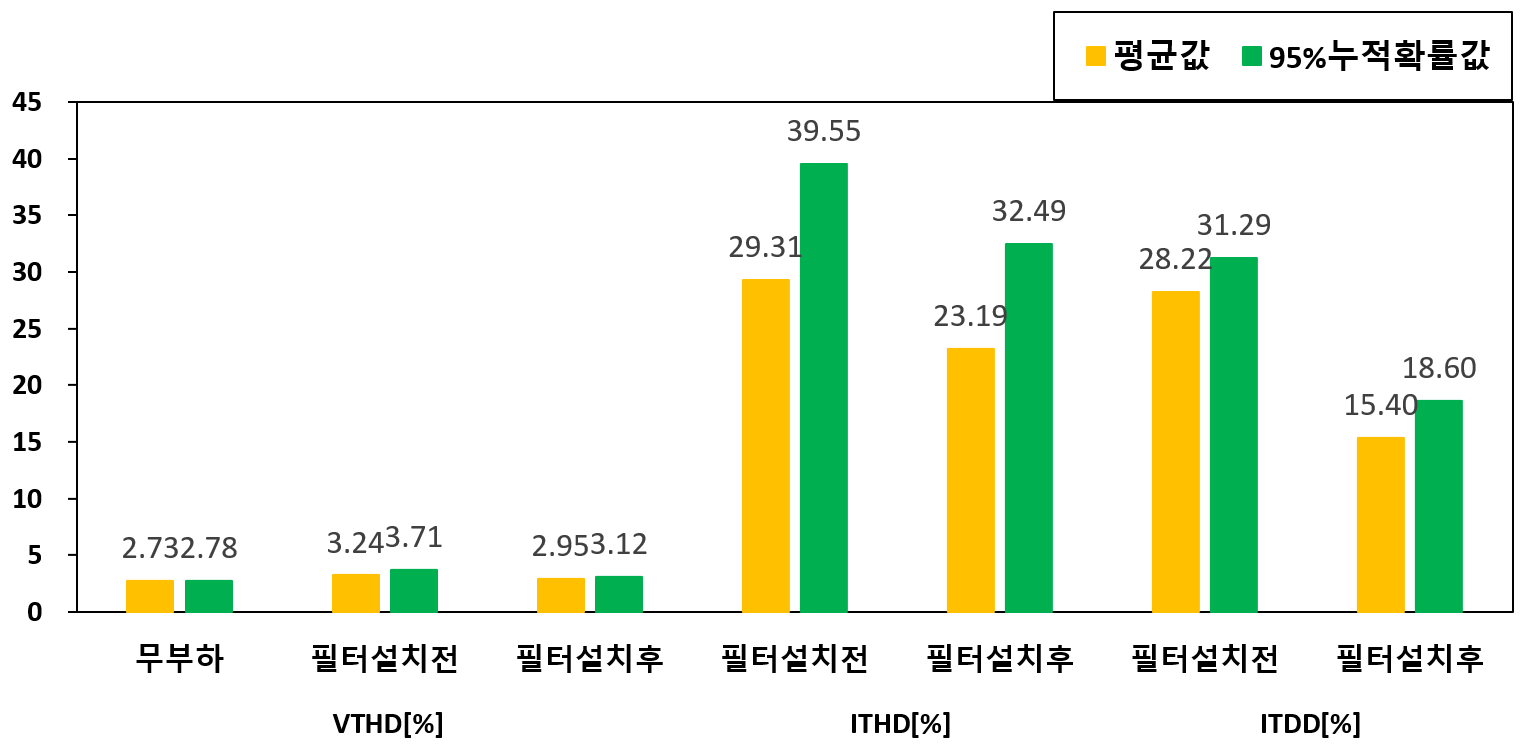 필터설치 전・후를 비교해보면 필터 설치 후, $V_{THD}$는 약 16%, $I_{THD}$는 18%, $I_{TDD}$는 41% 감소하는 효과를