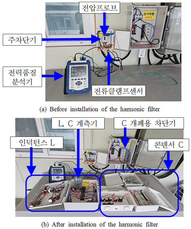 고조파를 측정하여 특성을 분석하였다. 이러한 고조파 분석을 통해 고조파 저감을 위한 고조파 필터를 설계하였으며, 설계된 LC 값을 적용한 필터를 설치하여