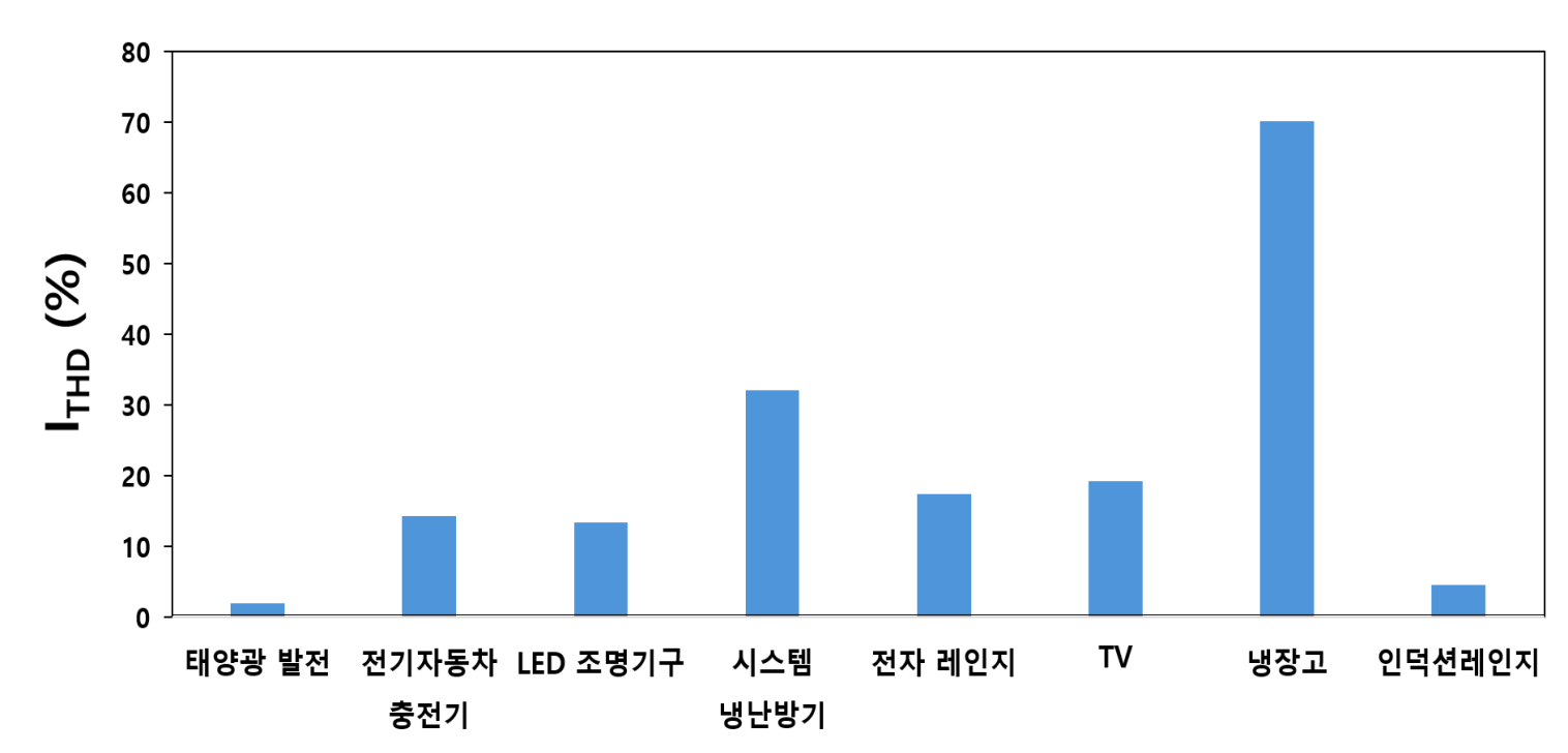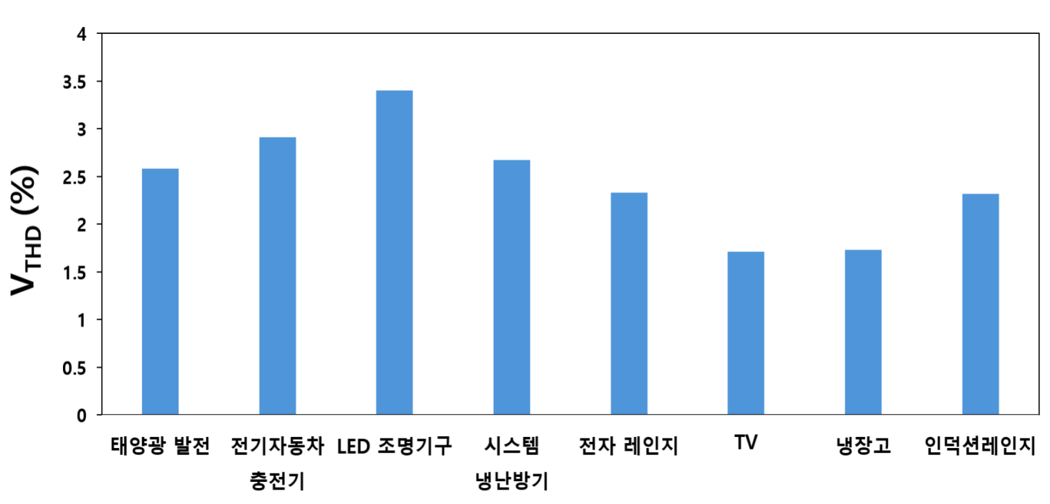 수행하였다. 태양광 발전 인버터, 전기자동차 충전기, LED 조명, 냉장고, 시스템 냉난방기 등 다양한 부하를 개별 측정한 결과, $V_{THD}$는