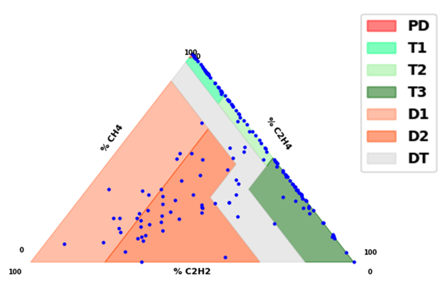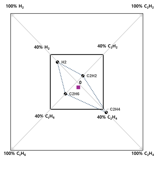 Duval triangle은 C2H2, C2H4, CH4 3종의 가스비를 통해 변압기의 상태를 진단하는 방법으로, 가스비를 통해 산출된 좌표를 산출해 변압기의 결함 유형을 결정한다. 결함 유형은 좌표가