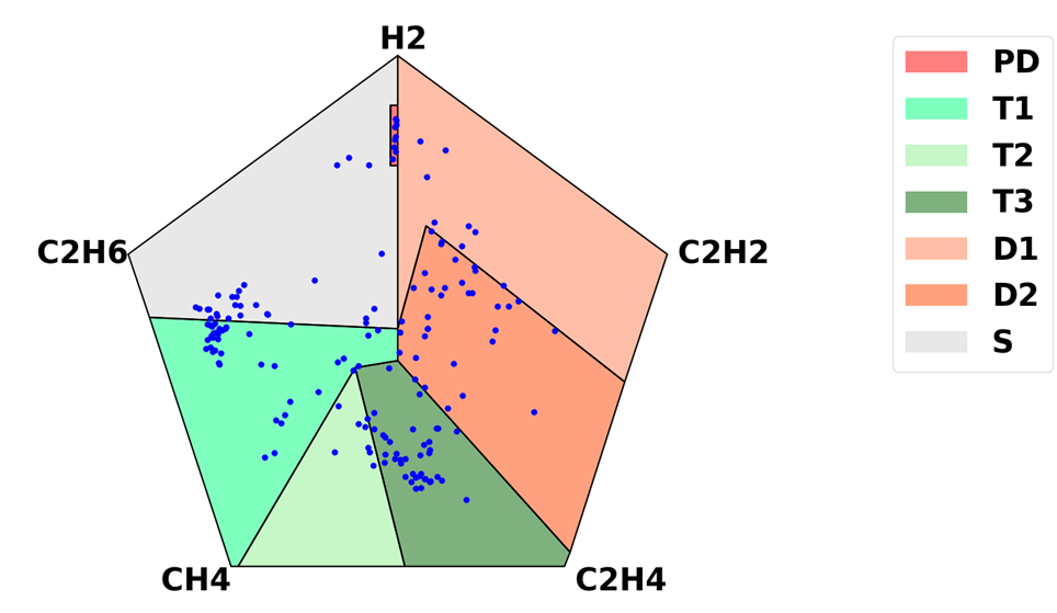 Duval Pentagon은 변압기의 결함 유형을 PD, T1, T2, T3, D1, D2, S 7개 영역으로 구분하며, 각 결함별 경계영역은 Table 3과 같다.