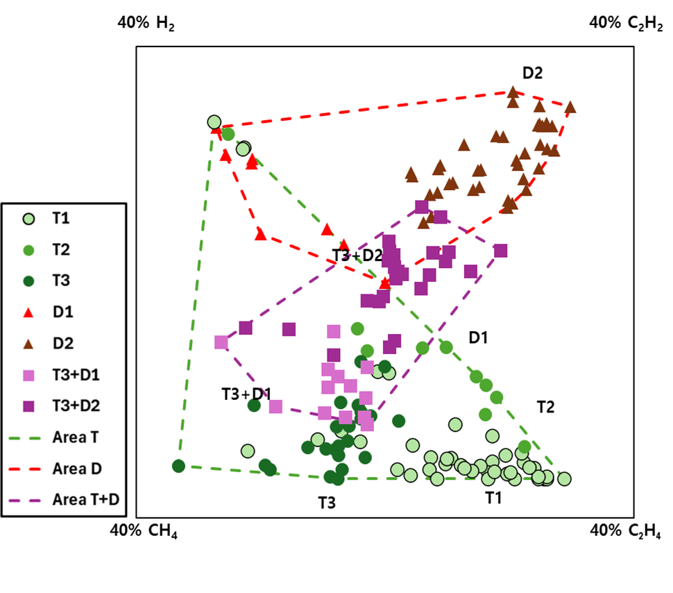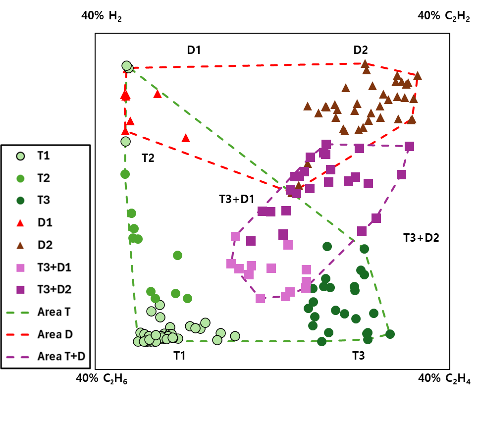 결함), T3(고온 결함)으로 구분된다. T1의 주요 가스는 CH4, C2H6이다. T2의 주요 가스는 C2H4, C2H6이며, T3의 주요 가스는 C2H4, C2H2이다. 전기적 결함은 D1(저에너지 방전), D2(고에너지 방전) 그리고 PD(partial discharge)로 구분된다. D1의 주요 가스는 H2,