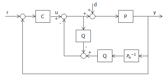 또한, $P$는 실제 플랜트, $P_{n}$은 공칭 모델(nominal model), $Q$는 저역통과 필터로서, (1)과 같은 형태를 주로 사용한다[6-8].