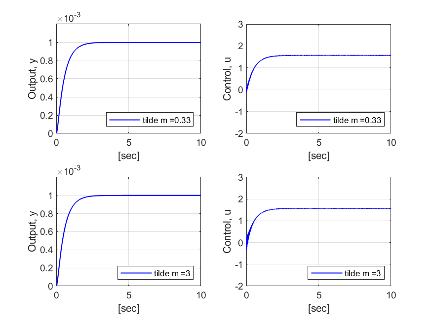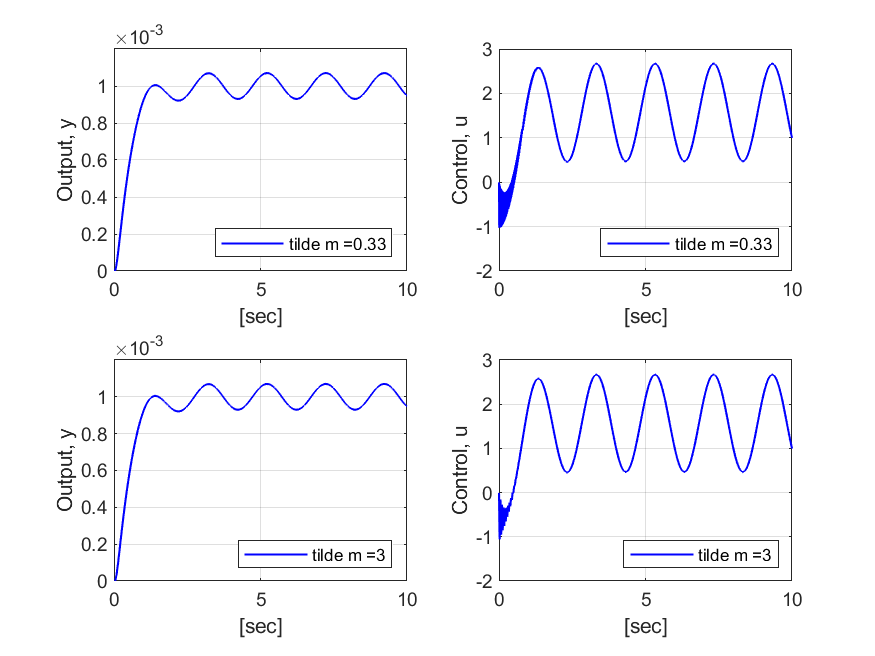 논문에서는 항상 $\tau = 10^{-4}$로 선정하였다.) Fig. 2는 컴퓨터 모의실험 결과이며, $\widetilde{m}= m/3$인 경우 시스템이 불안정하다는 것을 쉽게 확인할 수 있다. 즉, 대부분의 DOB