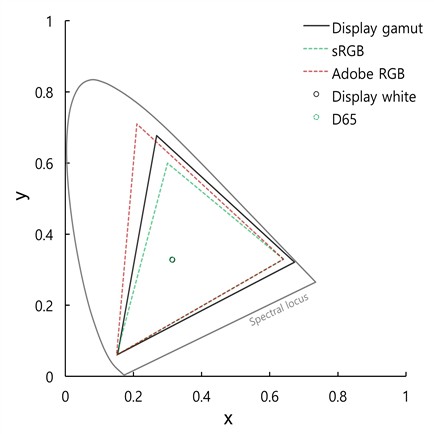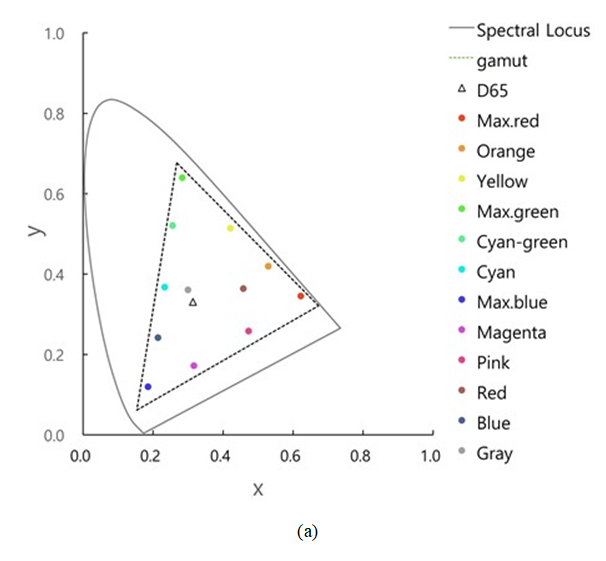 디스플레이의 색역은 DCI-P3로 2.6 감마값을 가지며, Fig. 1은 DCI-P3의 색역 경계를 나타낸다. 디스플레이는 gain-offset-gamma(GOG) 모델을 사용하여 특성화되었으며 RGBCMYW와 20개의