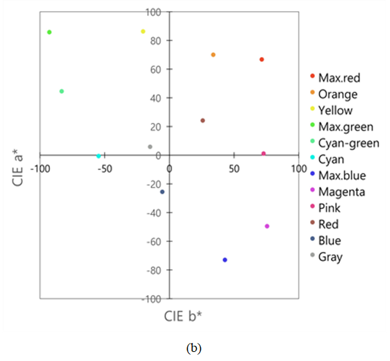 Cyan, Max.blue, Magenta, Pink, Red, Blue, 그리고 Gray로 명명했다. Table 2는 CIE D65 광원을 기반으로 한 컬러 센터들의 CIELAB 값을 나열하였다.