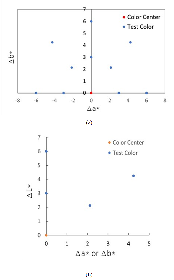 Zhao, et al.,(2020) [15]은 310$cd/m^{2}$의 휘도 수준을 가지는 광색역 디스플레이에서 그레이스케일 방법을 활용하여 색차 인지 실험을 수행하였다. 이 연구에서는 18명의