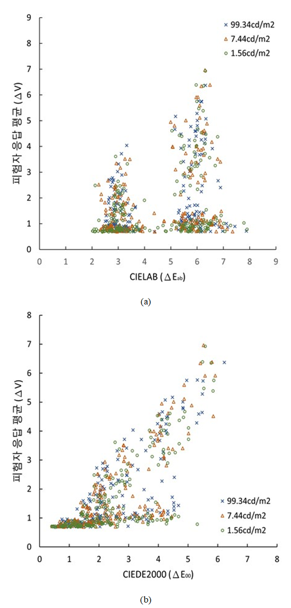 결과, 적응 휘도가 어두울수록 동일한 색차 자극에 대해 더 작은 차이로 평가하는 경향이 나타났다(기울기 <1). 이는 어두운 휘도 조건에서 색차가