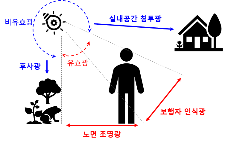 범위의 확대는 필요 이상의 빛 방출로 인해 빛공해(light pollution) 문제를 심화시키고 있다[1]. 빛공해는 눈부심, 생체 리듬 교란, 수면 장애, 암 발생 등에 영향을 미치는 것으로 알려져 있으며 동물의 번식 능력 저하, 조류의 충돌에 의한