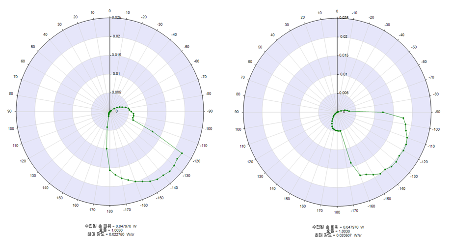 하여 70°~180°로 방출되는 빛을 Fig. 1에 설명한 유효광의 범위로 하였을 때, 광분포 효율(유효광/전체 방출광)이 100%가 되어 빛공해와 광분포 효율 모두 우수한 특성을 보이고 있다.