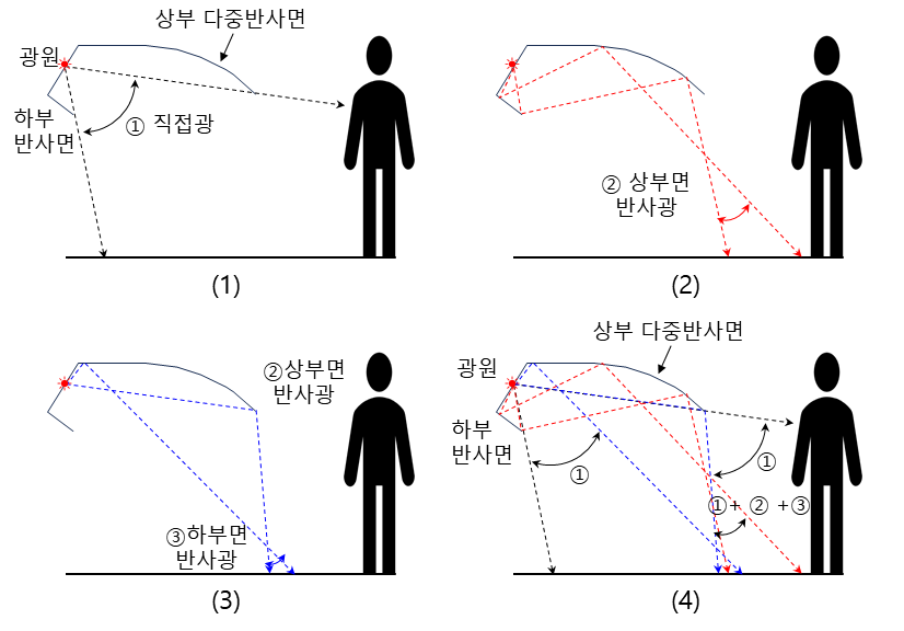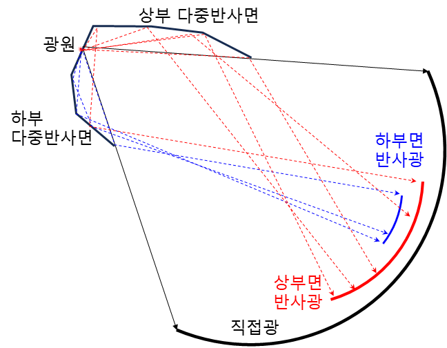 구조를 설계하는 것도 가능할 것이다. 동일한 반사판을 사용하지만 광원과 반사판의 각도 차이에 기인하는 광분포를 모두 고려하여야 하므로 하부 다중반사판과
