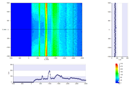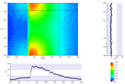 전산모사한 노면 조도 분포이다. 노면은 반사율 40%인 램버시안 반사면으로 가정하였다. 폭 0.3~3m, 보행자 진행 방향으로의 거리 3m인 노면에서