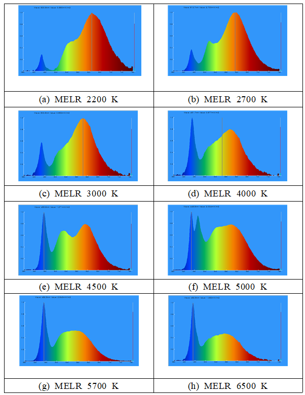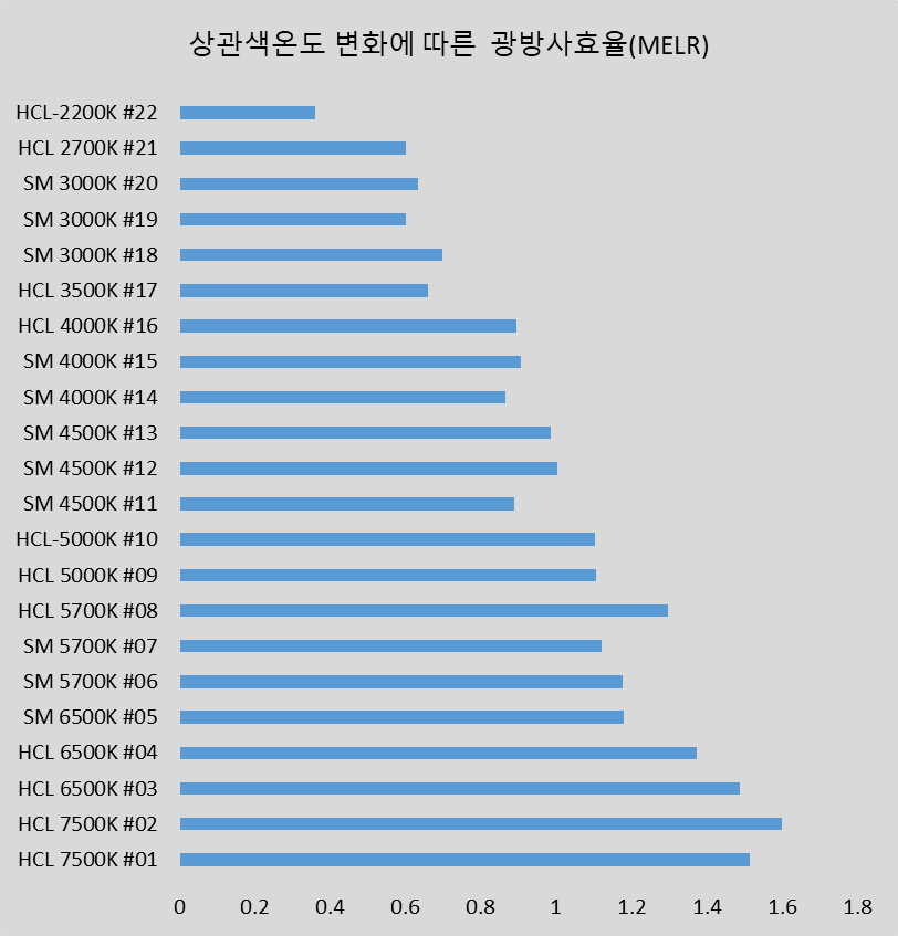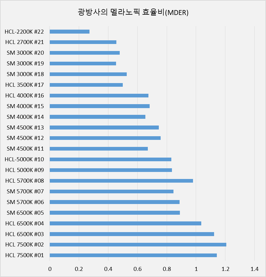 값이 증가한다. 또한 동일한 상관색온도이라 할지라도 440nm~490nm 영역의 스펙트럼 구성 비율이 제품별로 상이할 경우, 멜라노픽 방사효율 MELR,