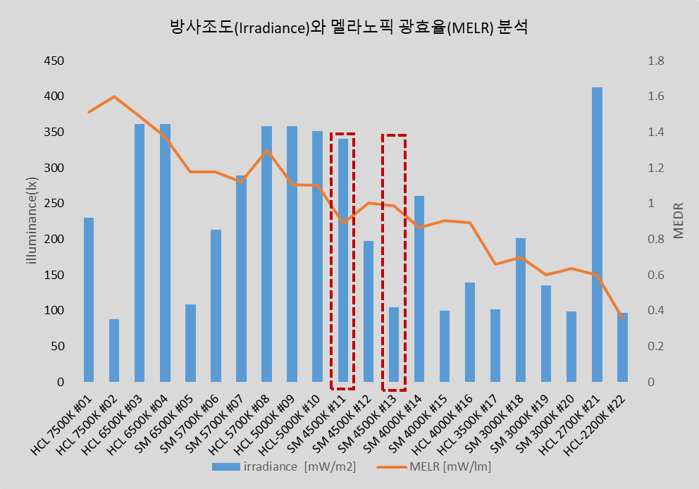 각 조명 시료의 조도 수준에 따라 비시각적 광특성을 분석한 결과, 감광신경절세포 ipRGC의 멜라노픽 민감도에 영향을 받는 광방사의 멜라노픽 효율