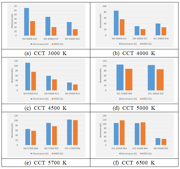 멜라노픽 주광 조도 MEDI의 경우 Fig. 8에서 확인할 수 있듯이, (a) 상관색온도 3000 K 범위에서 시료 3000 K #18의 MEDI = 34.5662 및 (c) 상관색온도 4500