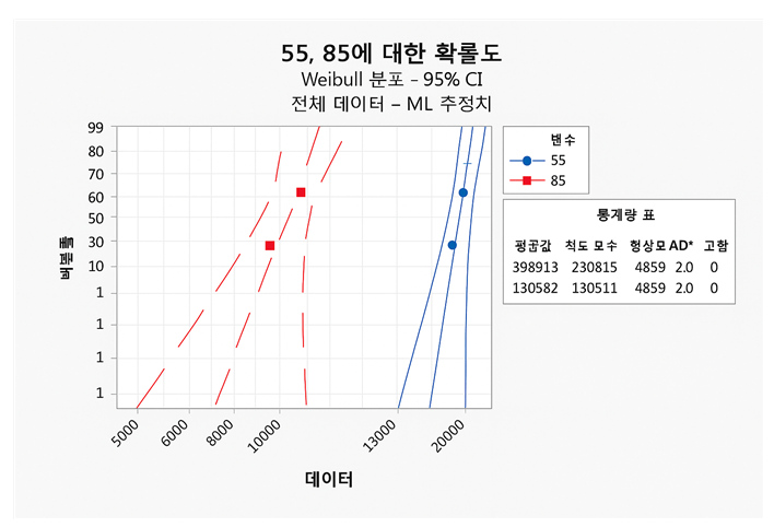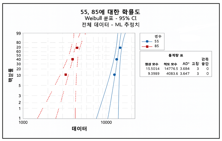 55℃와 85℃ 두 가속 조건에서 얻어진 모수(형상계수 $\beta$, 척도계수 $\eta$) 데이터를 Fig. 13과 같이 와이블 확률지(Weibull Probability Plot)에 나타내었다.