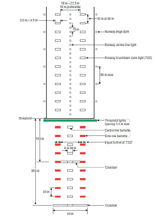 거리까지 30m 간격으로, CAT-II/III은 활주로 시단으로부터 300m 거리까지 30m 간격으로 설치한다[5].