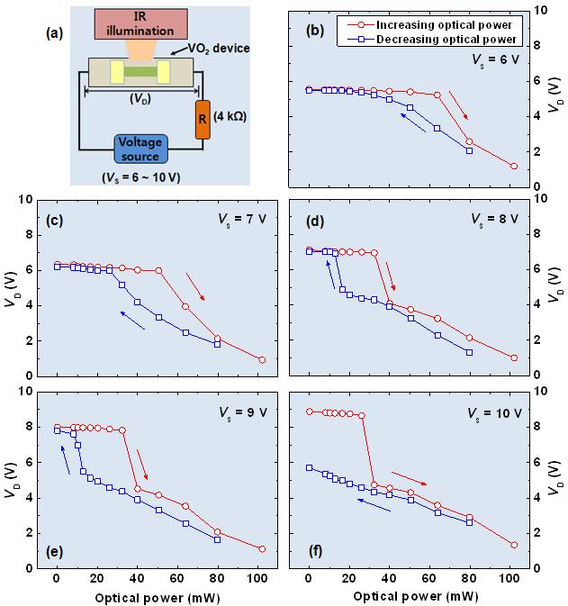 바이어스 전압효과에 따른 광 유도 쌍안정 스위칭을 조사하기 위하여 직류 전압원과 일반 저항, 그리고 VO2 소자를 직렬로 연결한 폐회로를 Fig. 3(a)와 같이 구성하였다. VO2 소자는 4kΩ의 저항 및 직류 전압원과 직렬로 연결되어 있으며, 쌍안정 스위칭 특성을 유도하기 위한 적외선 레이저는 소자 내의 VO2 박막에 집광되어 조사된다. Fig. 3(b), 3(c), 3(d), 3(e)와 3(f)는 각각 바이어스 전압이 6 V, 7 V, 8 V, 9 V, 10 V로 인가된 상태에서 적외선 빛의 파워에 따른 VO2 소자 양단에 걸린 전압 (VD) 의 정동작 응답을 나타낸 그림들이다. 측정 동안에는 빛의 파워를 ~102mW 까지 증가시키고, ~0.3μW 까지 다시 감소시켰다. Fig. 3(b)에서 관찰되었듯이 인가된 바이어스 전압이 6 V에서는 미세한 이력현상이 측정되었다. 이 경우에는 순방향 상전이가 ~80mW 이상의 빛의 파워에서 발생된