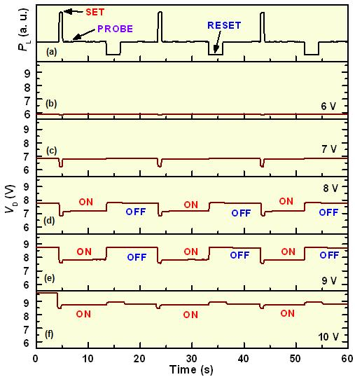 때문에 쌍안정 스위칭이 일어날 수도 있게 보여진다. 그러나 6 V와 같은 낮은 바이어스 전압에서는 높은 빛 파워 (> 80mW) 의 “SET” 펄스가