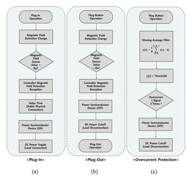 Fig. 3(c)는 과전류가 흐를 경우의 동작 알고리즘으로써 DC 전원이 플러그 장치로 공급되는 동안 전류 감지 센서는 실시간으로 DC 전원의 전류 크기를 모니터링한다.