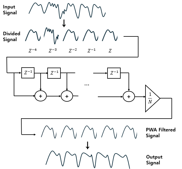 $x[n]$은 현재 시점 $n$에서의 원래 신호인 입력 신호, $N$은 이동 평균 필터의 윈도우 크기이다. 예를 들어 $N$이 5라면 현재 시점을