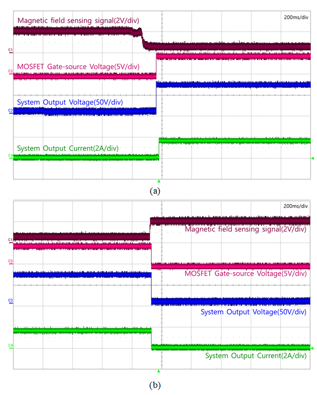 Fig. 6(a)와 (b)는 각각 플러그 인/아웃 상황에서의 파형을 나타낸다. 플러그 인 상황의 경우 자계 감지 센서는 2V의 High 신호를 유지하다가 플러그가