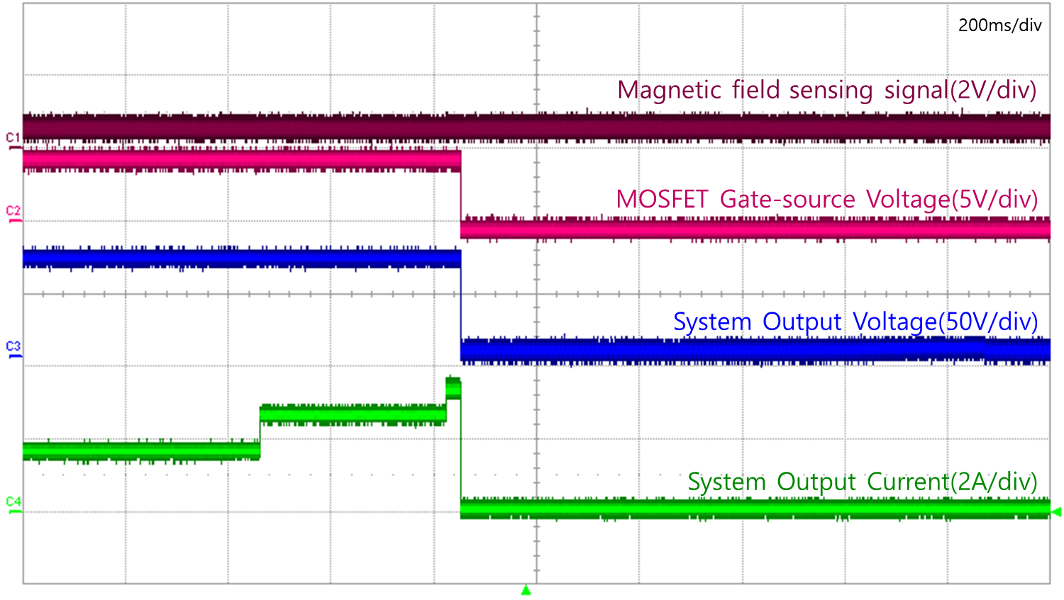 Fig. 7은 과전류 상황에서의 파형을 나타낸다. 출력 전류가 2A에서 점차 증가하여 임계값인 3A를 초과하게 되면 자계 감지 신호와 무관하게 컨트롤러에서 Fault