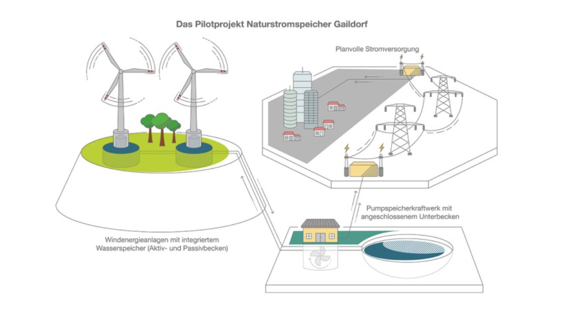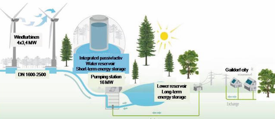Gaildorf의 하이브리드 양수발전 시스템은 다수의 풍력 발전 타워 하부에 물탱크의 물을 수압 관로를 활용하여 하부저수지의 양수발전과 결합한 에너지