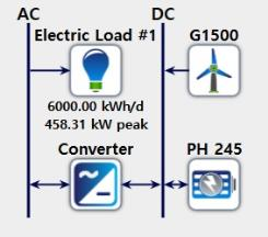 개발한 Homer Pro 모형을 활용하였고, OFF 그리드(독립형)로 설계하였다. 시뮬레이션 계통도를 그림으로 나타내면 Fig. 4와 같다. 본 논문에서는 화성시 A기업의 RE100 (Renewable Electricity 100%)을 공급하기 위해 일일 부하 평균 소비 전력량을