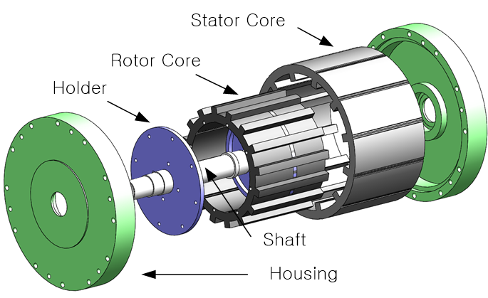 SRG는 고정자코어, 회전자코어, 샤프트, 홀더, 하우징으로 구성된다. Fig. 1에서는 발전기 조립 구조를 보여준다. 본 논문에서 다루는 SRG는 3상, 고정자 극수는 12극이며, 회전자 극수는 16극 조합으로 권선은 집중권을