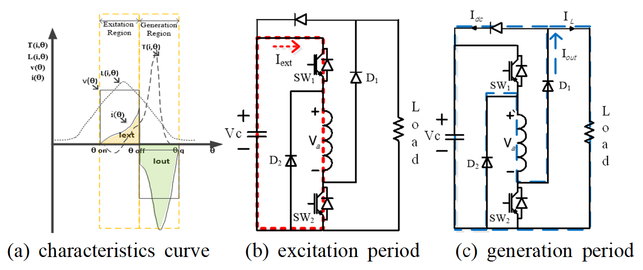 SRG 시스템은 Fig. 2(a)의 여자 영역($\theta_{on}-\theta_{off}$) 동안 기계적 입력 전력과 여자 소스에서 에너지를 흡수하게 되며, SW1과 SW2가