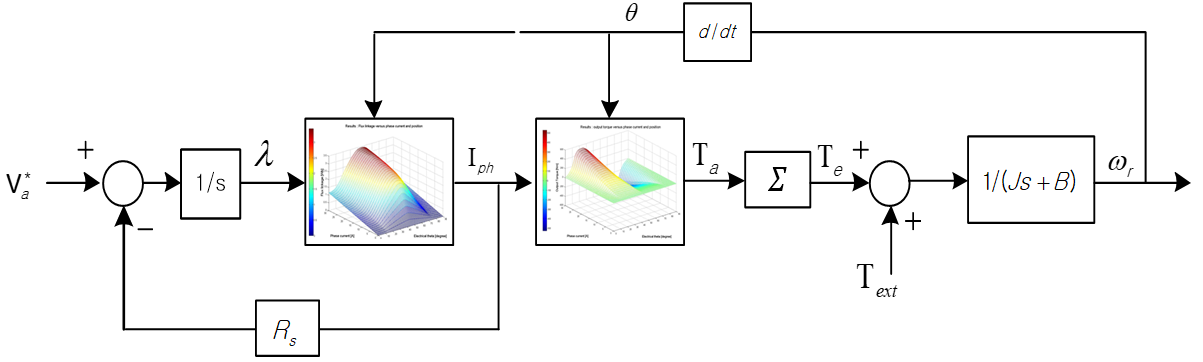여기서, $T_{e}$는 전자기 토크, $T_{ext}$는 외부 토크, $J$는 관성, $B$는 마찰 계수, $\omega$는 각속도를 나타낸다.