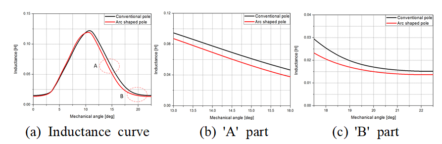 아크 각도를 18도로 선정하였다. Fig. 6은 SRG와 기존 구조(a) 및 제안된 구조(b)의 시뮬레이션 결과를 보여준다. 제안된 모델은 기존 모델 대비 인덕턴스 변화가 크게 나타나며, 그