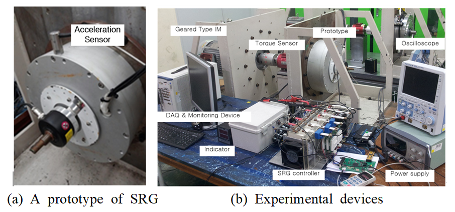 Fig. 7은 시뮬레이션 결과를 검증하기 위해 SRG 출력 성능 및 가속도 측정을 위한 실험 장치를 보여준다. SRG는 기어드 타입 유도전동기에 연결되어 기계적