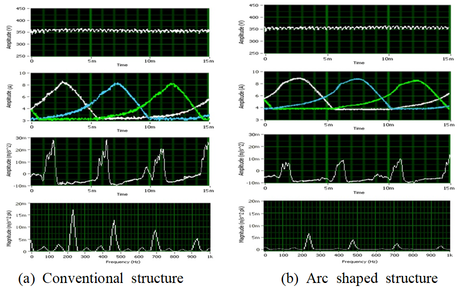 모델링을 사용하였다. 해석결과 제안된 모델은 기본 모델 대비 출력이 2% 향상되고 토크 리플이 38% 감소하는 결과를 얻었다. 그리고 가속도 측정시험을