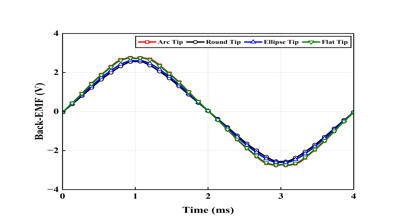 Fig. 4, 5, 6은 고정자 끝단 모양에 따른 무부하 해석 시 역기전력과 코깅토크 파형을 보여주고 Table 4에서 이들의 특성 결과를 나타내었다. 해석 결과 Arc 구조의 경우 고정자 모서리 끝단 길이가 회전자와 가까워 쇄교하는 자속량이 증가하여 역기전력과