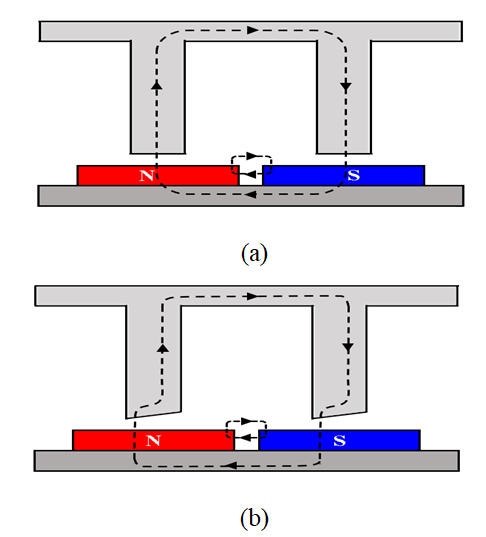 상호작용으로부터 발생하므로 식 (11)과 같이 표현된다[9]. Fig. 7은 대칭 및 비대칭 공극 구조에서의 자속 경로를 나타내며, Fig. 7(a)와 같은 대칭 구조에서는 자속 분포가 균일하여 접선 방향 힘이 일정하게 작용한다. 반면, Fig. 7(b)와 같이 양쪽 치 끝단의 길이를 서로 다르게 한 비대칭 공극 구조에서는 힘의 작용점이 한쪽으로 편중되어 접선 방향 힘이 특정 방향에 집중된다.