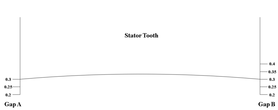 전동기의 성능 개선을 위해 설계 변수 기반으로 반응표면분석법을 적용하여 최적 설계를 진행하였다. Fig. 8은 비대칭 공극 구조의 설계 인자를 나타내며, 양쪽 모서리 공극 길이를 Gap A와 Gap B로 구분하였다. 회전 방향이 반시계인 경우를 고려했을